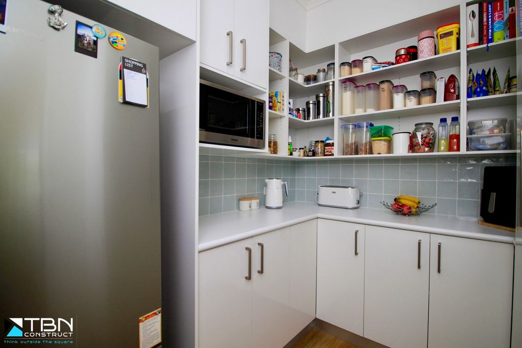 A butlers pantry, just off the kitchen, using the space wisely and using a pop of colour to make this space bright.
